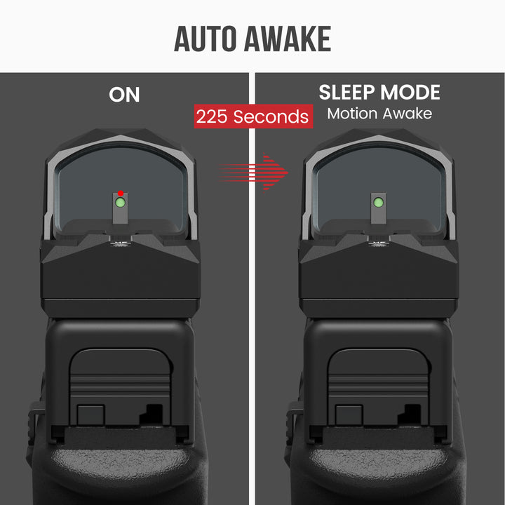 - Shake Awake : After about 225 seconds without sensing any motion, the sight will enter into sleep mode. Even the slightest movement will wake it up to the previous brightness setting.