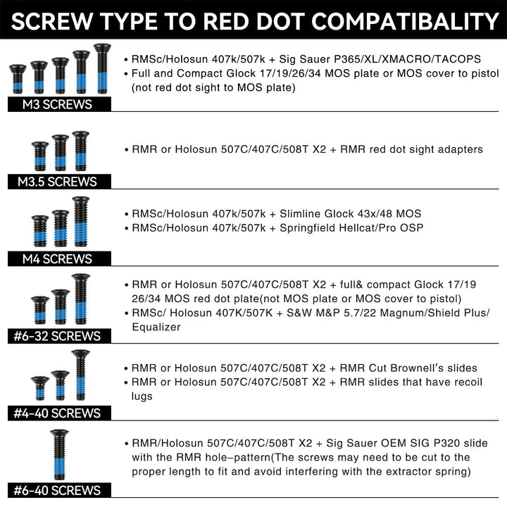 - Secure Your Red Dot Instantly – Attach optics to slides, adapter plates, or custom mounts effortlessly with 18 precision screw sets (M3, M3.5, M4, 6-32, 4-40, 6-40). Perfectly fits Glock, SIG Sauer, and other mainstream pistols.