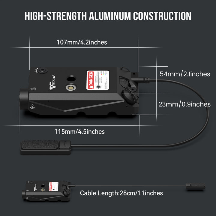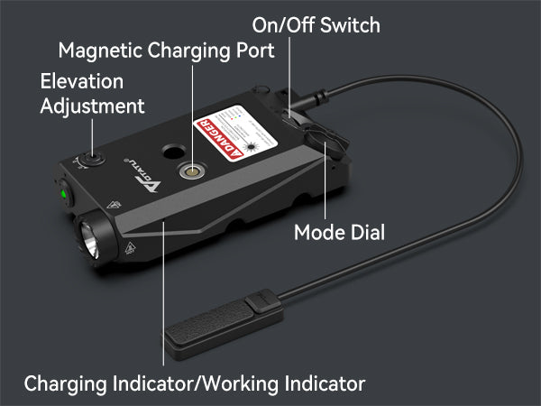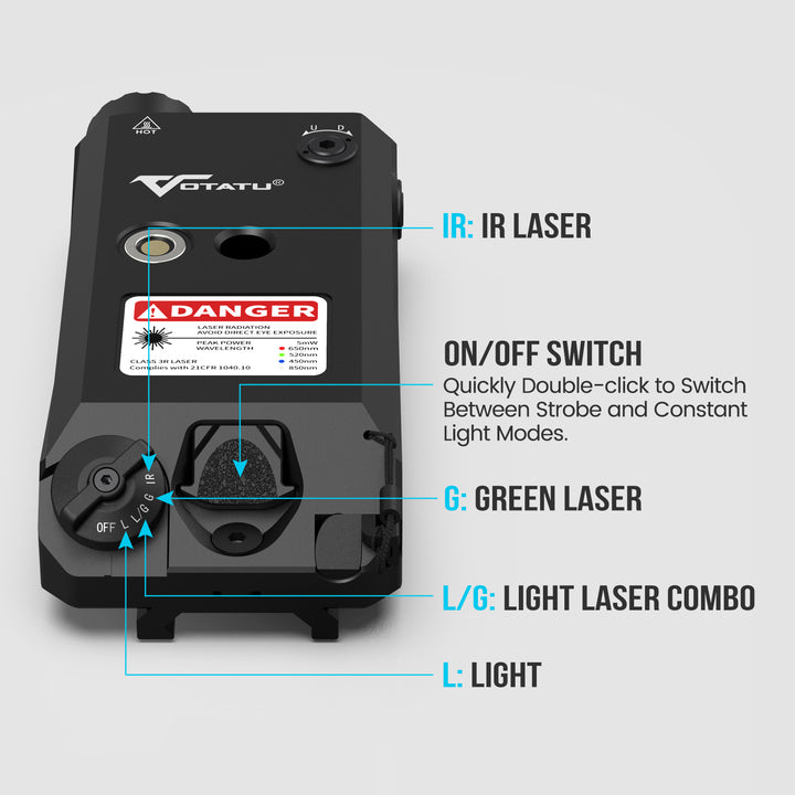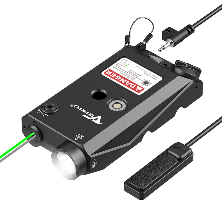 - 4 Modes for green laser only, tactical light only, green laser and light combined, IR laser only, quickly switch with mode dial. Equipped with solid and strobe function.